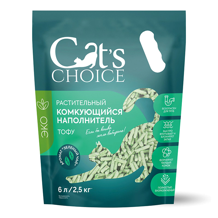 Натуральный растительный наполнитель Cat’s choice из спрессованных соевых волокон с ароматом зеленого чая. Наполнитель быстро абсорбирует влагу и блокирует неприятный запах. Премиальные гранулы диаметром 2 мм обладают способностью образовывать сверхпрочные комки, которые впоследствии легко утилизировать в канализацию. Натуральный состав делает его безопасным для кошек и людей. С Cat’s choice легко поддерживать чистоту и уют в доме.