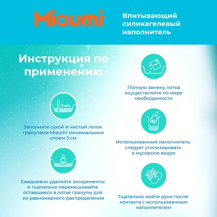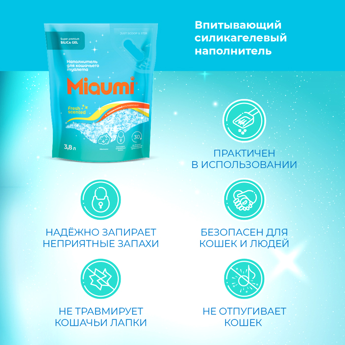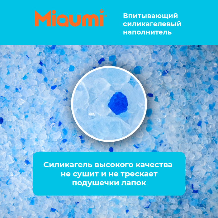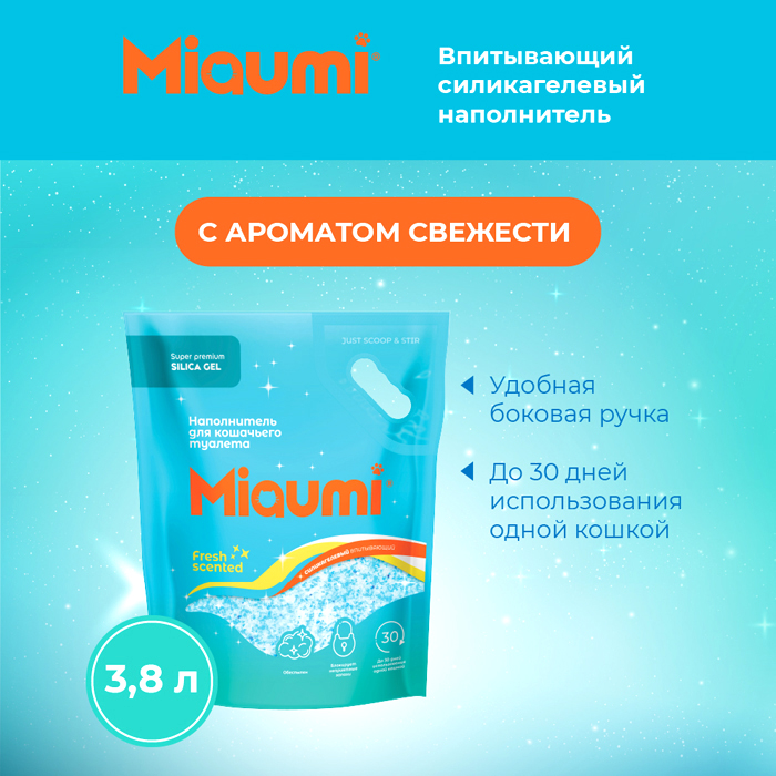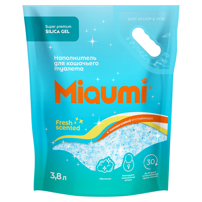 Miaumi® Silica Gel Fresh Scented — суперпремиальный впитывающий силикагелевый наполнитель для кошачьего туалета с тонким ароматом свежести. Наполнитель произведен из высококачественного силикагеля и обладает премиальным внешним видом. Отличительная особенность наполнителя Miaumi® Fresh Scented — гранулы небольшого размера, которые за счет своей микропористой структуры способны моментально впитывать большее количество жидкости и надежно запирать внутри кристаллов неприятные запахи и бактерии. Каждая гранула наполнителя обработана специальным образом и не имеет острых краев, поэтому наполнитель не ранит и не сушит нежные лапки кошки. На 99,9% не содержит пыли, что позволяет сохранять лапки питомца и пол в доме чистыми. При контакте с влагой появляется тонкий аромат свежести. Miaumi® Fresh Scented – «УМНЫЙ» силикагель со свойством «замыкать» неприятный запах внутри кристаллов до 1 месяца! ПРЕИМУЩЕСТВА: ✔ НАДЕЖНО ЗАПИРАЕТ НЕПРИЯТНЫЕ ЗАПАХИ: Микропористая структура гранул обладает повышенной способностью впитывать жидкость, замыкать неприятные запахи и бактерии внутри кристаллов силикагеля. ✔ НЕ ТРАВМИРУЕТ КОШАЧЬИ ЛАПКИ: Гранулы без острых краев безопасны для кошачьих лапок, а благодаря силикагелю высокого качества подушечки лапок не сушатся и не трескаются. ✔ ПРАКТИЧЕН В ИСПОЛЬЗОВАНИИ: Небольшие разноцветные гранулы 1-4 мм легко просеиваются через специальные отверстия совка и имеют эстетичный внешний вид. Аромат раскрывается активнее при контакте с влагой. ✔ БЕЗОПАСЕН ДЛЯ КОШЕК И ЛЮДЕЙ: Наполнитель произведен из высококачественных компонентов натурального происхождения, не токсичен и безопасен для кошек и людей. ✔ НЕ ОТПУГИВАЕТ КОШЕК: При попадании жидкости на гранулы издает негромкий треск в отличии от других силикагелевых наполнителей.