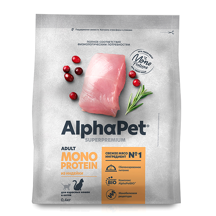 АльфаПет МОНОПРОТЕИН сухой корм для взрослых кошек с индейкой, 400г, ALPHAPET Monoprotein