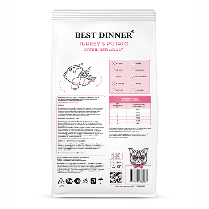 Best Dinner Sterilised Adult Turkey & Potato, 1,5кг. Высококачественный полнорационный корм для кошек Best Dinner с индейкой и картофелем, создан с учетом физиологических потребностей кошек и котят. Вкусная индейка богата необходимыми аминокислотами для здоровья питомца и правильного роста котят. Клюква и DL - метионин, добавленные в рецептуру профилактируют мочекаменную болезнь, а юкка Шидигера прекрасно подойдет для вывода шерсти и устранения неприятных запахов из лотка. Гранулы в форме сердечек не оставят равнодушными даже самых привередливых кошек.