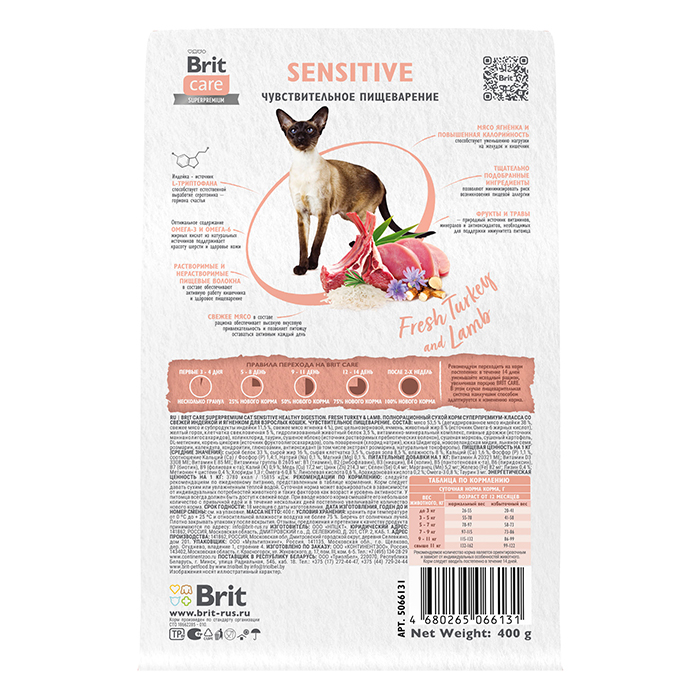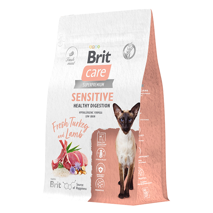 БРИТ КЕА Sensitive Healthy Digestion сухой корм с индейкой и ягненком для взрослых кошек, 400г. Сухой корм Брит Кеа суперпремиум-класса с индейкой и ягненком предназначен для кошек с чувствительным пищеварением. Формула корма разработана для поддержания здоровья пищеварительной системы и нормализации работы кишечника, обеспечивая легкое усвоение питательных веществ. Индейка и ягненок — это источники гипоаллергенного белка, который подойдет для кошек с чувствительным пищеварением и склонностью к пищевым аллергиям. Включение витаминов, минералов и антиоксидантов способствует поддержке иммунной системы. Этот корм также содержит растворимые и нерастворимые пищевые волокна, что способствует поддержанию здоровой микрофлоры кишечника и нормализации стула. BritCare — это сбалансированный рацион для кошек с чувствительным здоровьем. ПРЕИМУЩЕСТВА: ✔ Индейка — естественный источник L-триптофана, гормона счастья ✔ Натуральные ингредиенты для здорового роста костей и зубов ✔ Жирные кислоты из натуральных источников для красоты шерсти и здоровья кожи ✔ Свежее мясо для активности в течение дня ✔ Витамины, минералы и антиоксиданты для поддержки иммунитета питомца ✔ Растворимые и нерастворимые пищевые волокна для здорового пищеварения и микрофлоры кишечника.