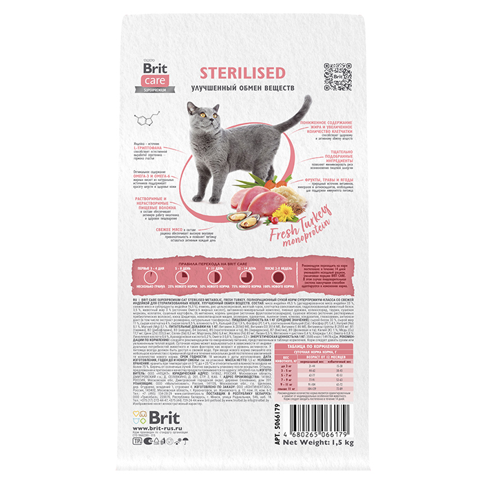 БРИТ КЕА Sterilised Metabolic Monoprotein сухой корм с индейкой для стерилизованных кошек, 1,5кг. Сухой корм с индейкой для стерилизованных кошек разработан специально для поддержания здоровья питомцев после стерилизации. Его монопротеиновая формула на основе индейки помогает контролировать вес и поддерживать метаболизм на оптимальном уровне, что особенно важно для стерилизованных кошек. Корм содержит легкоусвояемый белок, витамины и минералы, обеспечивающие кошке необходимую энергию и поддерживающие иммунную систему. Высокое содержание натуральных ингредиентов способствует поддержанию здоровья кожи и шерсти. Брит Кеа также помогает предотвратить набор лишнего веса и поддерживает нормальный обмен веществ, что делает его отличным выбором для стерилизованных кошек. ПРЕИМУЩЕСТВА: ✔ Индейка — естественный источник L-триптофана, гормона счастья ✔ Пониженное содержание жира и увеличенное количество клетчатки для здорового и активного обмена веществ ✔ Жирные кислоты из натуральных источников для красоты шерсти и здоровья кожи ✔ Свежее мясо для активности в течение дня ✔ Витамины, минералы и антиоксиданты для поддержки иммунитета питомца ✔ Растворимые и нерастворимые пищевые волокна для здорового пищеварения и микрофлоры кишечника.