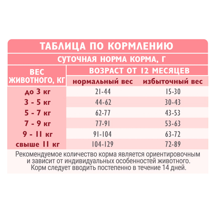 Состав: Мясо индейки 49,5 % (дегидрированное мясо индейки 26,6 %, свежее мясо и субпродукты индейки 22,9 %), ячмень цельнозерновой, желтый горох, клетчатка свекловичная, животный жир 6,5 % (источник Омега-6 жирных кислот), рис цельнозерновой, растительный протеин (в том числе картофельный и гороховый), гидролизованный животный белок 3,5 %, витаминно-минеральный комплекс, пивные дрожжи, сушеное яблоко (источник растворимых пребиотических волокон), сушеная морковь, коллаген (очищенный, легкоусвояемый), льняное семя, холин-хлорид, таурин, DL-метионин, корень цикория (источник фруктоолигосахаридов), новозеландская мидия (источник хондропротекторов), розмарин, экстракт одуванчика лекарственного: корни, листья и соцветия (источник витаминов и минералов для поддержки иммунитета и профилактики заболеваний мочевыводящих путей), сублимированные ягоды клюквы (источник органических кислот, профилактирующих МКБ), хондроитин, глюкозамин, антиоксиданты (витамин Е, экстракт розмарина, натуральные токоферолы), юкка Шидигера. ПИЩЕВАЯ ЦЕННОСТЬ НА 1 КГ (СРЕДНИЕ ЗНАЧЕНИЯ): сырой белок 32 %, сырой жир 11 %, сырая клетчатка 3,7 %, сырая зола 8,8 %, влажность 8 %, Кальций (Са) 1,52 %, Фосфор (Р) 1,05 %, соотношение Кальций (Са) / Фосфор (Р) 1,45:1, Натрий (Na) 0,28 %, Магний (Mg) 0,07 %. ПИТАТЕЛЬНЫЕ ДОБАВКИ НА 1 КГ (СРЕДНИЕ ЗНАЧЕНИЯ): Витамин A 20560 МЕ; Витамин D3 3514 МЕ; Витамин Е (α-токоферол) 86 МЕ; Витамины группы В 2555 мг: В1 (тиамин), В2 (рибофлавин), В3 (ниацин), В4 (холин), В5 (пантотеновая к-та), В6 (пиридоксин), В7 (биотин), В9 (фолиевая к-та); Калий (K) 0,66 %; Медь (Cu) 17,7 мг; Цинк (Zn) 223,5 мг; Селен (Se) 0,3 мг; Марганец (Mn) 5,4 мг; Железо (Fe) 83 мг; Лизин 1,31 %; Метионин + цистеин 0,78 %; Хлориды 2,16 г; Омега-6 1,3 %: Линолевая кислота 1,29 %, Арахидоновая кислота 0,01 %; Омега-3 0,1 %; Таурин 3,2 г. ЭНЕРГЕТИЧЕСКАЯ ЦЕННОСТЬ НА 1 КГ: 3535 ккал / 14791 кДж.