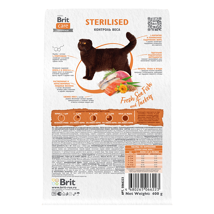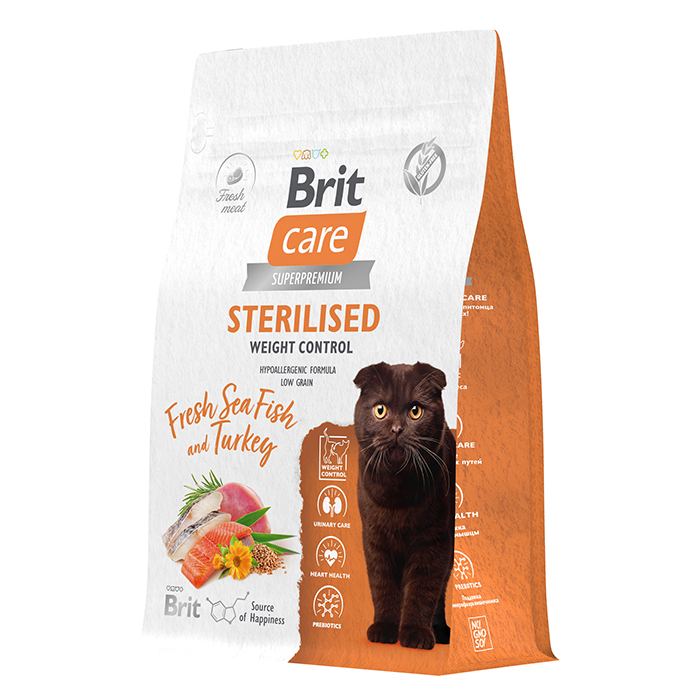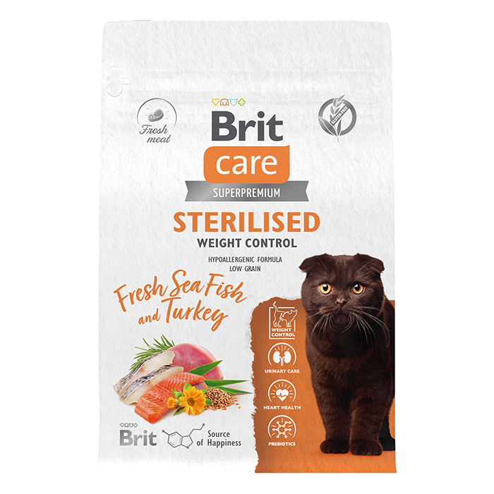БРИТ КЕА Sterilised Weight Control сухой корм с морской рыбой и индейкой для стерилизованных кошек, 400г. Полнорационный сухой корм суперпремиум-класса с морской рыбой и индейкой для стерилизованных кошек. Контроль веса. Стерилизованные кошки могут набирать вес из-за снижения активности. Это приводит к болезням сердца, печени и почек. ПРЕИМУЩЕСТВА: ✔ Индейка — естественный источник L-триптофана, гормона счастья ✔ L-карнитин и пониженное содержание жира для оптимального веса животного ✔ Жирные кислоты из натуральных источников для красоты шерсти и здоровья кожи ✔ Свежее мясо для активности в течение дня ✔ Витамины, минералы и антиоксиданты для поддержки иммунитета питомца ✔ Растворимые и нерастворимые пищевые волокна для здорового пищеварения и микрофлоры кишечника.