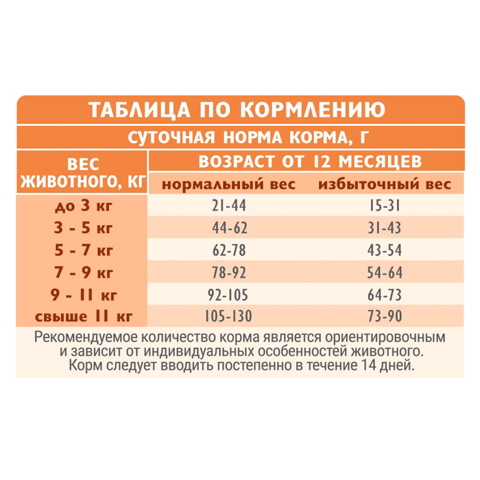 Состав: Рыба и мясо 47 % (дегидрированное мясо индейки 22,4 %, свежая рыба 14,6 %, свежая белая рыба 5 %, дегидрированная рыба 5 %), ячмень цельнозерновой, клетчатка свекловичная, желтый горох, рис цельнозерновой, животный жир 6 % (источник Омега-6 жирных кислот), растительный протеин (в том числе картофельный и гороховый), гидролизованный животный белок 3,5 %, витаминно-минеральный комплекс, пивные дрожжи (источник маннанолигосахаридов), сушеное яблоко (источник растворимых пребиотических волокон), сушеная морковь, льняное семя, холин-хлорид, таурин, DL-метионин, корень цикория (источник фруктоолигосахаридов), новозеландская мидия (источник хондропротекторов), экстракт одуванчика лекарственного: корни, листья и соцветия (источник витаминов и минералов для поддержки иммунитета и профилактики заболеваний мочевыводящих путей), сублимированные ягоды клюквы (источник органических кислот, профилактирующих МКБ), хондроитин, глюкозамин, антиоксиданты (витамин Е, экстракт розмарина, натуральные токоферолы), L-карнитин, юкка Шидигера. ПИЩЕВАЯ ЦЕННОСТЬ НА 1 КГ (СРЕДНИЕ ЗНАЧЕНИЯ): сырой белок 31 %, сырой жир 10,5 %, сырая клетчатка 3,6 %, сырая зола 8,5 %, влажность 8 %, Кальций (Са) 1,54 %, Фосфор (Р) 1,06 %, соотношение Кальций (Са) / Фосфор (Р) 1,45:1, Натрий (Na) 0,34 %, Магний (Mg) 0,07 %. ПИТАТЕЛЬНЫЕ ДОБАВКИ НА 1 КГ (СРЕДНИЕ ЗНАЧЕНИЯ): Витамин A 20864 МЕ; Витамин D3 3310 МЕ; Витамин Е (α-токоферол) 84 МЕ; Витамины группы В 2555 мг: В1 (тиамин), В2 (рибофлавин), В3 (ниацин), В4 (холин), В5 (пантотеновая к-та), В6 (пиридоксин), В7 (биотин), В9 (фолиевая к-та); Калий (K) 0,63 %; Медь (Cu) 16,4 мг; Цинк (Zn) 208,4 мг; Селен (Se) 0,27 мг; Марганец (Mn) 5,2 мг; Железо (Fe) 83 мг; Лизин 1,35 %; Метионин + цистеин 0,85 %; Хлориды 2,23 г; Омега-6 1,22 %: Линолевая кислота 1,24 %, Арахидоновая кислота 0,01 %; Омега-3 0,09 %; Таурин 2,9 г. ЭНЕРГЕТИЧЕСКАЯ ЦЕННОСТЬ НА 1 КГ: 3507 ккал / 14674 кДж.