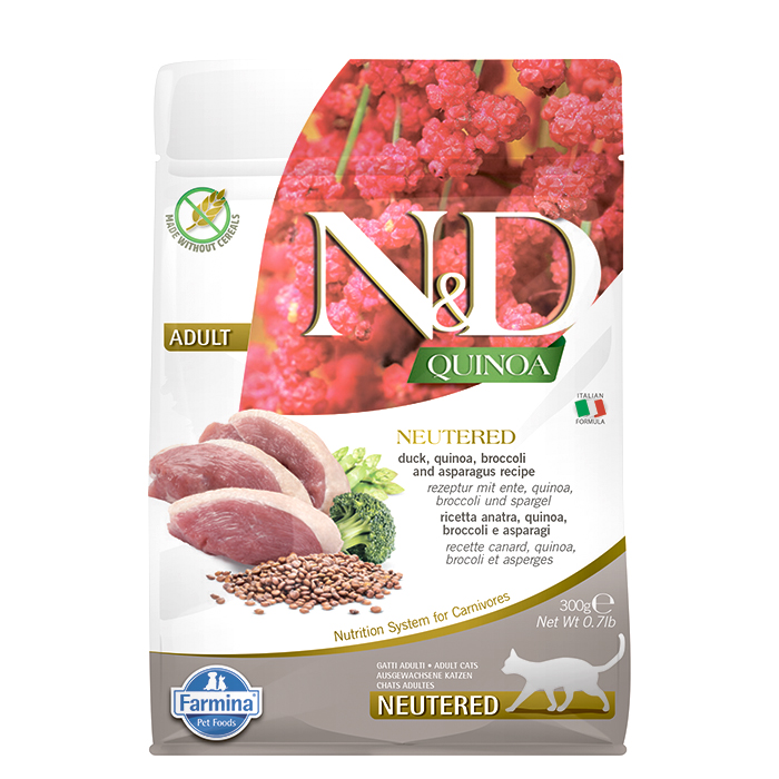 FARMINA N&D QUINOA NEUTERED CAT. Полнорационный беззерновой корм для стерилизованных кошек с уткой, киноа, брокколи и спаржей, 300г.