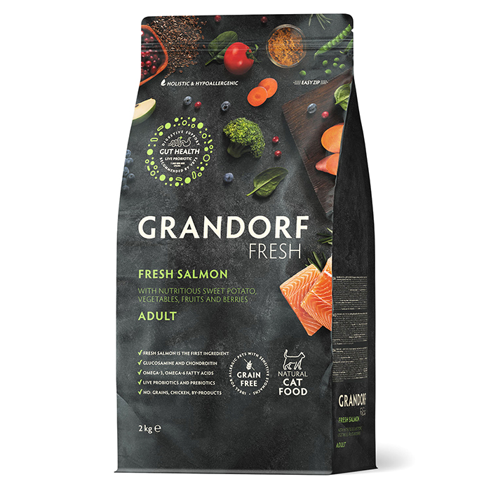 Грандорф Фреш ЭДАЛТ беззерновой корм с живыми пробиотиками для кошек, свежее филе лосося с бататом, 2кг, GRANDORF FRESH Adult Cat