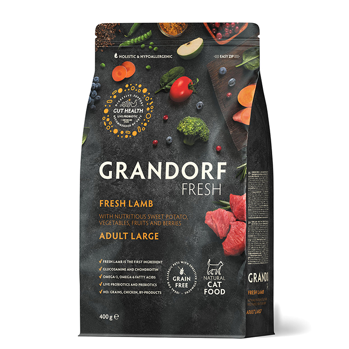 Грандорф Фреш ЛАДЖ беззерновой корм с живыми пробиотиками для крупных кошек, свежее мясо ягненка с бататом, 400г, GRANDORF FRESH Large Cat