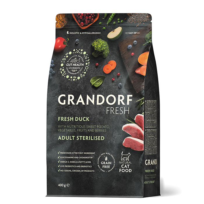 Грандорф Фреш СТЕРИЛАЙЗД беззерновой корм с живыми пробиотиками для стерилизованных кошек, свежее мясо утки с бататом, 400г, GRANDORF FRESH Sterilized Cat