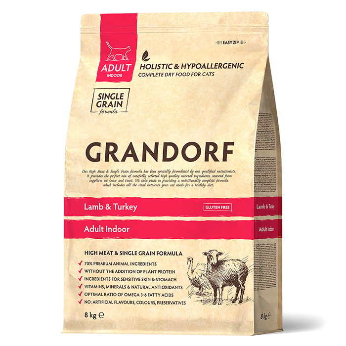 Грандорф ИНДОР сухой корм для кошек, не покидающих помещение, с ягненком, индейкой и бурым рисом, 8кг, GRANDORF Indoor