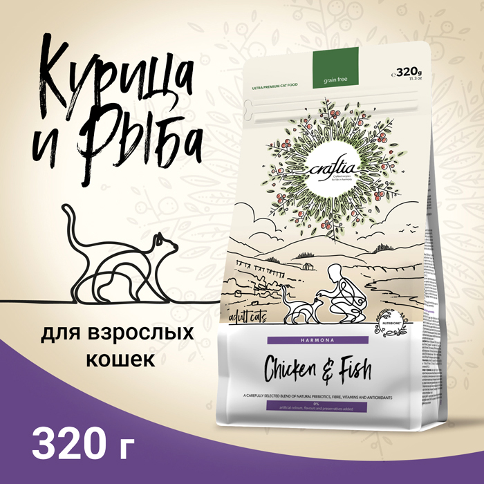Крафтия Гармония ЭДАЛТ КЭТ сухой корм для кошек с курицей и рыбой, 320г, CRAFTIA HARMONA Adult Cat
