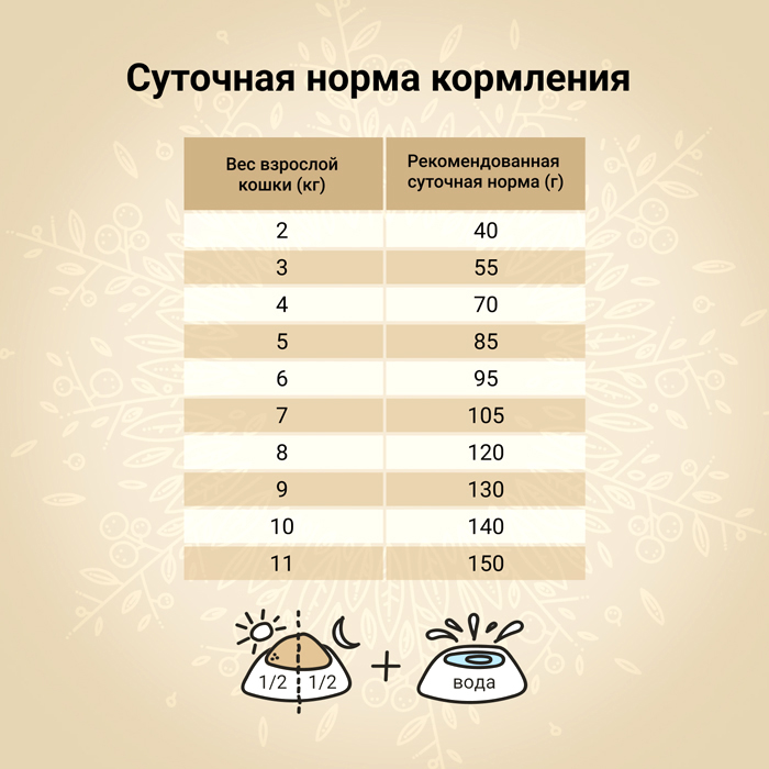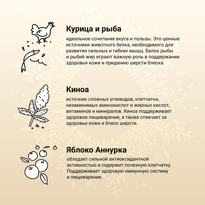 Состав: сырая курица (20%), гороховый крахмал, дегидратированный куриный белок (10%), дегидратированный белок сельди (10%), сельдь (8%), лосось (8%), куриный жир, рыбий жир (лососевый), экстрактированные семена киноа (4%), гидролизованный рыбий белок (треска, пикша), гидролизованные белки птицы (курица, индейка), куриные потроха (печень, сердце, почки), сухое яйцо (куриное), льняное семя, сухая свекольная пульпа, люцерновая мука, волокна гороха, сушеная черника (0,5%), сушеная клюква, сушеная ацерола, сушеное яблоко Аннурка, сушеная спаржа, сушеная тыква, инулин цикория (0,4%), дрожжевой экстракт (источник маннанолигосахаридов) (0,3%), фруктоолигосахариды (0,3%), аскофиллум узловатый (Ascophyllum Nodosum), карбонат кальция, монокальцийфосфат, хлорид калия, хлорид натрия, сухие пивные дрожжи, алоэ вера, розмарин, куркума, календула, шелуха и семена подорожника, юкка Шидигера. Питательная ценность: сырой белок 37,6%; сырой жир 18,3%; сырая клетчатка 1,7%; сырая зола 6,3%; кальций - 1,05%; фосфор - 0,9%; Омега-6 жирные кислоты - 2,7%; Омега-3 жирные кислоты - 0,8%; докозагексаеновая кислота (ДГК) - 0,35%; эйкозапентаеновая кислота (ЭПК) - 0,25%. Энергетическая ценность: 3925 ккал/кг. Питательные добавки на 1 кг: витамин А – 18000ME; витамин D3 – 1800ME; витамин Е – 215мг; витамин С – 180мг; ниацинамид - 54мг; D-пантенол - 22,5мг; витамин B2 - 11,25мг; витамин B6 - 6мг; витамин B1 - 11,25мг; биотин - 0,54мг; фолиевая кислота - 0,54мг; витамин B12 - 0,09мг; холина хлорид - 2700мг; Цинк (Хелат цинка гидрата глицина) - 79,9 мг; Марганец (Хелат марганца гидрата глицина) - 17мг; Железо [Хелат железа (II) гидрата глицина] - 61,2мг; Медь [Хелат меди (II) гидрата глицина] - 11,9мг; Йод (безводный йодат кальция) - 1,7мг; Cелен (L-селенометионин) - 0,29мг; DL-метионин, технически чистый - 3000мг; Tаурин 1980 мг. Антиоксиданты: экстракт токоферолов из растительных масел.