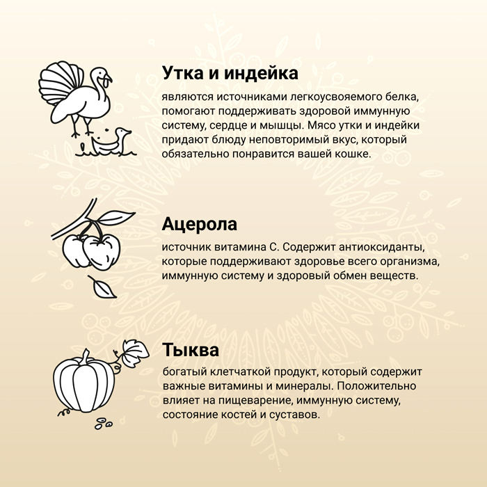 Состав: сырая утка (20%), сырая индейка (16%), гороховый крахмал, дегидратированный утиный белок (10%), дегидратированный белок индейки (10%), куриный жир, рыбий жир (лососевый), киноа (4%), гидролизованный рыбий белок (треска, пикша), гидролизованные белки птицы (курица, индейка), куриные потроха (печень, сердце, почки), сухое яйцо (куриное), льняное семя, сухая свекольная пульпа, люцерновая мука, волокна гороха, сушеная ацерола (0,5%), сушеная тыква (0,5%), сушеная черника, сушеная клюква, сушеное яблоко Аннурка, сушеная спаржа, инулин цикория (0,4%), дрожжевой экстракт (источник маннанолигосахаридов) (0,3%), фруктоолигосахариды (0,3%), аскофиллум узловатый (Ascophyllum Nodosum), карбонат кальция, монокальцийфосфат, хлорид калия, хлорид натрия, сухие пивные дрожжи, алоэ вера, розмарин, куркума, календула, семена и шелуха подорожника, юкка Шидигера.