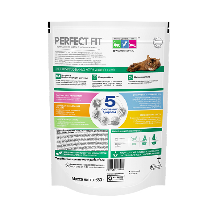 В рационе PERFECT FIT™ Sterile мы учли потребности организма кошки, прошедшей стерилизацию. Витамины группы B и железо помогут ей оставаться активной, пребиотики поддержат работу пищеварительной системы, а специальный адаптированный нутриентный профиль позволит следить за оптимальным балансом веса. Здоровье мочевыводящей системы - баланс минералов, помогающий снижению риска формирования камней и поддержанию здоровья мочевыводящей системы. Контроль веса - специальная рецептура с пониженным содержанием жира позволяет снизить потребление калорий в каждом кормлении. Жизненная сила - обогащен витаминами группы В и железом для поддержания жизненной силы.