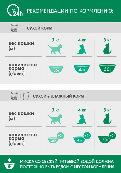 Содержание питательных веществ (100 г): белок – 38 г; жир – 12 г; зола – 8,7 г; влажность – 6 г; клетчатка – 1,7 г; кальций – 1,5 г; фосфор – 1,1 г; витамин А – 670 МЕ; витамин D3 – 50 МЕ; витамин Е – 27 мг. Добавленные вещества (кг): таурин – 1680 мг; моногидрат сульфата цинка – 405 мг; тетрагидрат сульфата железа – 160 мг; моногидрат сульфата марганца – 37 мг; пентагидрат сульфата меди – 33 мг; моногидрат йодата кальция – 2,9 мг. Энергетическая ценность: (100) 380 ккал / 1590 кДж.