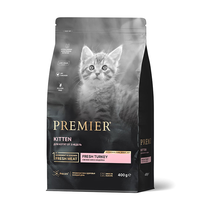PREMIER для котят от 3 недель, а также беременных и кормящих кошек, с индейкой, 400г. Полнорационный сухой корм супер-премиум класса на основе свежего мяса индейки для котят с 3-недельного возраста, беременных и кормящих кошек. Идеально подходит для питомцев, склонных к аллергии, поможет укрепить иммунитет и улучшить состояние шерсти и кожи. СВЕЖЕЕ МЯСО БЕЗ КОСТЕЙ: Мы используем свежее мясо высшего сорта, изначально пригодное для употребления человеком. Это гарантирует, что ваш питомец получает высокопитательный, чрезвычайно вкусный, легко усвояемый высококачественный источник белка. НИЗКОЗЕРНОВОЙ СОСТАВ: Благодаря низкозерновому и безглютеновому составу наши корма легко усваиваются и отлично подходят для животных с чувствительным пищеварением или пищевой аллергией. ФРУКТЫ, ОВОЩИ И ЯГОДЫ: Великолепное сочетание натуральных фруктов, овощей и ягод обеспечивает организм дополнительными полезными питательными веществами, которые жизненно необходимы для поддержания здоровья питомца. ГЛЮКОЗАМИН, ХОНДРОИТИН: Хондропротекторы стимулируют процессы регенерации и замедляют дегенерацию (разрушение) хрящевой ткани. Содержащиеся в составе нашего корма хондроитин сульфат и глюкозамин принимают участие в образовании хрящей, биосинтезе синовиальной жидкости. ВИТАМИНЫ, АНТИОКСИДАНТЫ: Витамины Е, С и Селен содержащиеся в составе корма выступают в роли мощной антиоксидантной системы, что способствует сохранению крепкого здоровья вашего питомца и снижает риски преждевременных возрастных изменений. НАТУРАЛЬНЫЕ ПРЕБИОТИКИ: Формула корма идеально сбалансирована и включает в себя натуральные пребиотики, являющиеся неотъемлемым звеном в создании правильной кишечной микрофлоры питомца. ПРОФИЛАКТИКА ЗДОРОВЬЯ КАЖДЫЙ ДЕНЬ: Богатые питательными веществами ингредиенты, помогают предотвратить аллергические реакции и пищевую непереносимость, обеспечивая иммунное и пищеварительное здоровье питомца. МЫ НЕ ИСПОЛЬЗУЕМ: Курицу, субпродукты, пшеницу, кукурузу, сою, глютен, ГМО, красители, ароматизаторы, консерванты.