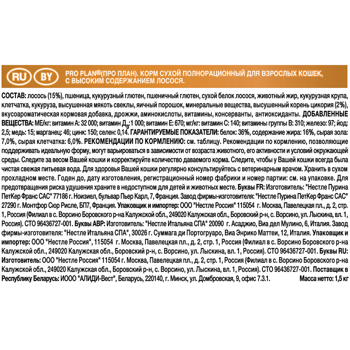 Состав: лосось (15%), пшеница, кукурузный глютен, пшеничный глютен, сухой белок лосося, животный жир, кукурузная крупа, клетчатка, кукуруза, высушенная мякоть свеклы, яичный порошок, минеральные вещества, высушенный корень цикория (2%), вкусоароматическая кормовая добавка, дрожжи, аминокислоты, витамины, консерванты. Добавленные вещества: МЕ/кг: витамин А: 32 000; витамин Д3: 1 000; витамин E: 670; мг/кг: витамин C: 140; витамины группы B: 310; железо: 97; йод: 2,5; медь: 15; марганец: 46; цинк: 150; селен: 0,14. Гарантированные показатели: белок: 36%, содержание жира: 16%, сырая зола: 7,0%, сырая клетчатка: 6,0%.