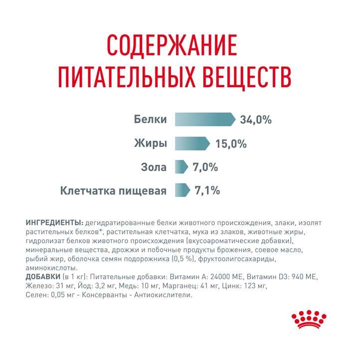 ИНГРЕДИЕНТЫ: дегидратированные белки животного происхождения (птица), изолят растительных белков*, мука из зерновых культур, растительная клетчатка, пшеница, рис, животные жиры, гидролизат белков животного происхождения (вкусоароматические добавки), минеральные вещества, дрожжи, соевое масло, рыбий жир, оболочки и семена подорожника (0,5 %), фруктоолигосахариды. ДОБАВКИ (в 1 кг): Питательные добавки: Витамин A: 24000 ME, Витамин D3: 900 ME, Железо: 28 мг, Йод: 2,8 мг, Медь: 8 мг, Марганец: 36 мг, Цинк: 88 мг, Ceлeн: 0,04 мг - Консерванты - Антиокислители. СОДЕРЖАНИЕ ПИТАТЕЛЬНЫХ ВЕЩЕСТВ: Белки: 34 % - Жиры: 15 % - Минеральные вещества: 6,8 % - Клетчатка пищевая: 7,5 % - Общая клетчатка: 15,1 %. *L.I.P.: специально отобранные белки с высокой степенью усвояемости.