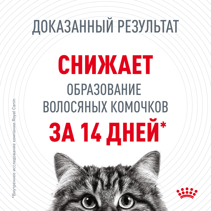 Многие кошки тратят на уход за собой значительную часть дня и в процессе вылизывания могут проглотить большое количество выпавших волос. Они скапливаются в желудочно-кишечном тракте и формируют волосяные комочки, которые затем отрыгиваются или выводятся с фекалиями. Продукт ROYAL CANIN® Hairball Care содержит комплекс различных видов пищевой клетчатки, в частности, семя подорожника, в большом количестве содержащее растительную слизь, и нерастворимая клетчатка, нормализующая кишечный транзит. Благодаря этим компонентам ежедневно проглатываемая кошкой шерсть выводится преимущественно естественным путем, в процессе дефекации, не закупоривая пищеварительный тракт и не провоцируя срыгивание. Точно выверенный нутриентный профиль ROYAL CANIN® Hairball Care с высоким содержанием белков (34%) и жиров (15%) обеспечивает оптимальный баланс питательных веществ. Доказано, что уже после 14 дней применения только ROYAL CANIN® Hairball Care с фекалиями выводится в два раза больше шерсти. *Внутреннее исследование компании Royal Canin, 2013 г. - Сравнение проводилось с контрольным кормом для взрослых кошек, не содержащим эксклюзивного комплекса «Hairball Care». Корм разработан для поддержания нормальной работы мочевыделительной системы взрослой кошки за счет сбалансированного содержания минералов. Для удовлетворения индивидуальных предпочтений каждого животного ROYAL CANIN® Hairball Care выпускается также в форме влажного продукта. Масса нетто: 0,4 кг, 2 кг, 10 кг.