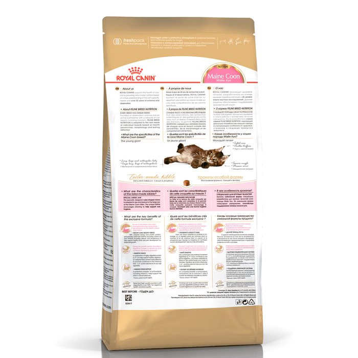 Maine Coon Kitten Киттен Сухой корм специально для котят породы Мэйн Кун (в возрасте до 15 месяцев). Продукт учитывает потребности животных этой породы, связанные с возможной предрасположенностью к заболеваниям, особенностями анатомического строения и пищевого поведения. Формула продукта ROYAL CANIN® Maine Coon Kitten разработана с учетом диетологических потребностей вашего котенка породы мейн-кун. Адаптированный рацион с самого раннего возраста – залог здоровья животного на протяжении всей жизни. В процессе роста мейн-куна его иммунная система также развивается. Запатентованный комплекс антиоксидантов (в число которых входит витамин E) в составе ROYAL CANIN® Maine Coon Kitten поддерживает иммунитет котенка. Пищеварительная система кошек развивается постепенно – у маленьких котят она еще не до конца сформирована. Поэтому им требуется корм, содержащий качественные, хорошо усваиваемые белки. ROYAL CANIN® Maine Coon Kitten содержит белки очень высокой степени усвояемости (L.I.P.), а также пребиотики, регулирующие баланс микрофлоры кишечника. Долгий период роста котят породы Мейн Кун обеспечивает формирование свойственного для этой породы мощного сложения. Содержит необходимое количество калорий, белков, витаминов (в том числе витамина D) и минералов (в том числе кальция и фосфора), обеспечивающих гармоничный рост и здоровое развитие костей и суставов. Крокеты кубической формы специально разработаны для крупных челюстей котят породы Мэйн Кун. Их уникальная форма стимулирует разгрызание, способствуя поддержанию гигиены полости рта. Для удовлетворения индивидуальных предпочтений каждого животного ROYAL CANIN® Maine Coon Kitten выпускается также в форме влажного продукта в виде кусочков в соусе. Масса нетто: 0,4 кг, 2 кг, 4 кг, 10 кг.