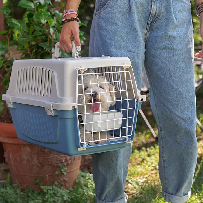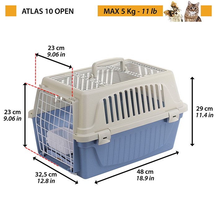 Переноска Atlas Open - прекрасный вариант для мелких собак и кошек. Идеально подходит для путешествия на поезде, машине и самолете, особенно летом,в жаркую погоду. Дверка изготовлена из стали с пластиковым покрытием и надежно крепится к пластиковому основанию. Верхняя часть также открывается для большей циркуляции воздуха, а также для наблюдения за питомцем. Переноска Atlas Open оборудована удобной ручкой; боковые клипсы гарантируют быструю и надежную фиксацию. Две дверки (спереди и сверху) удобны для кормления животного и доступа внутрь. Пластиковая кормушка и х/б подушка входят в комплект.