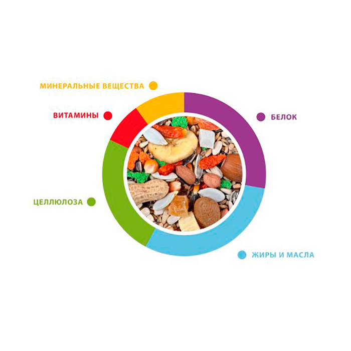 Состав: Кукуруза 8.3%, подсолнечник 5.9%, пшеница 5.2%, тыквенное семя 5.2%, овес 5.9%, ячмень 5.2%, гречиха 1.4%, миндаль, фундук, яблоко, плоды рожкового дерева, банан, стручковый перец , арахис, экструдированные кукуруза и пищевой.