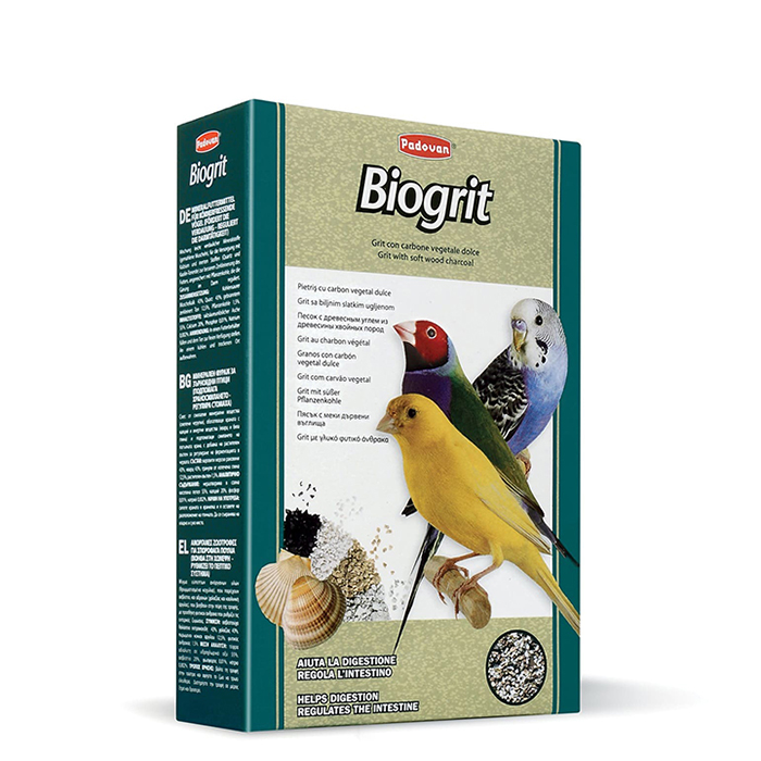 Padovan Biogrit. Минеральная добавка для зерноядных декоративных птиц (способствует пищеварению - регулирует работу кишечника). Присутствие камешков улучшает перистальтику (мышечную активность) и степень перемалывания корма. Это повышает его перевариваемость и усвояемость минимум на 10%. Является источником минералов, витаминов, макро и микроэлементов, содержит активированный уголь. Эти компоненты используются для улучшения пищеварения, устранения посторонних запахов (связанных с неправильным процессом брожения), для профилактики деформации скелета, укрепления клюва и придания прочности яичной скорлупе, при авитаминозах, обладает общеукрепляющими свойствами для восстановления организма после перенесенных болезней или стресса. Насыпанная на дно клетки, служит прекрасным гигиеническим наполнителем.