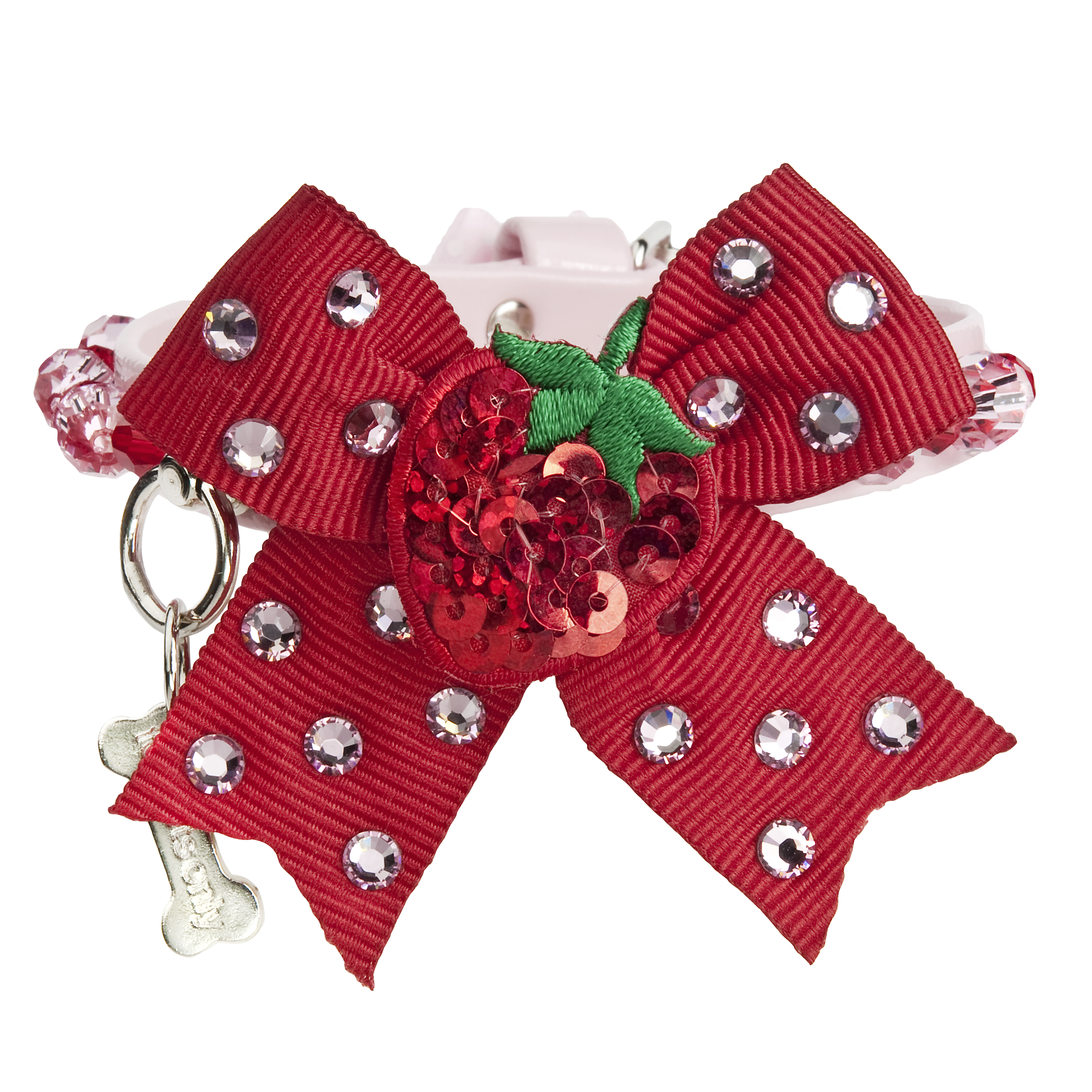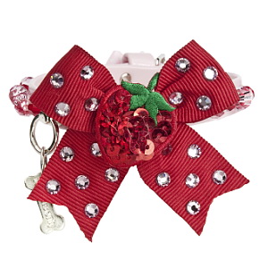 Розовый ошейник из лакированой экокожи, декорирован бусинами и аппликацией в виде банта с клубникой в пайетках и стразах. Размер 13-20 см, подходит для собак , мелких пород, внутренний шов запаяно, что не даст повредить шерсть Вашего любимца.