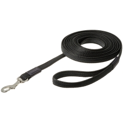 Предназначен для дрессировки собак, а также для повседневного использования. Выдерживает нагрузку до 300 кг, поэтому подойдет для самых сильных и активных собак. Не скользит, не «обжигает» руки. Вращающийся вертлюг карабина предотвращает перекручивание поводка.