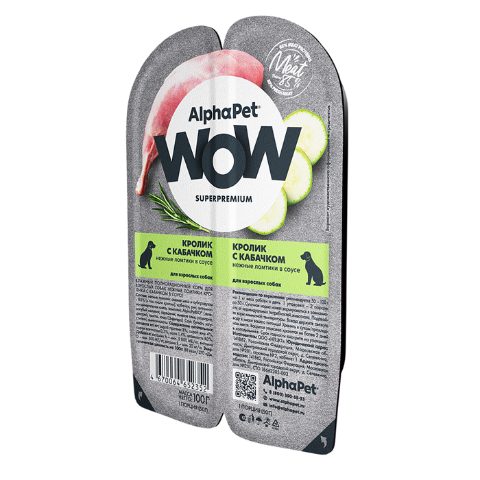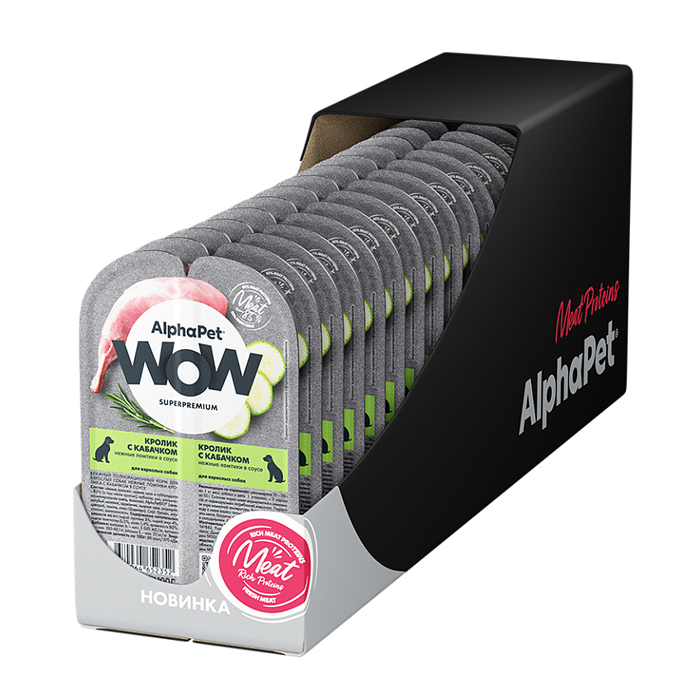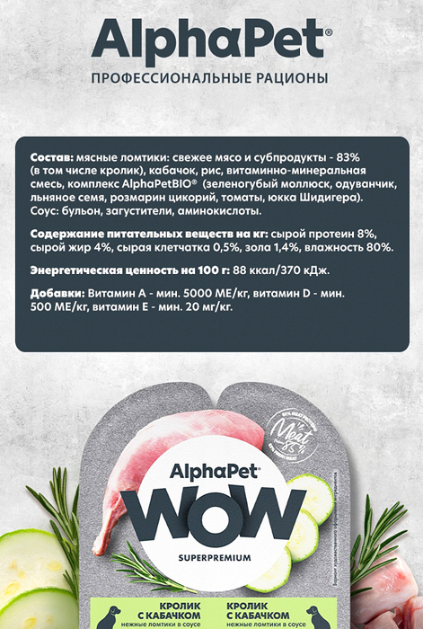 AlphaPet WOW Superpremium влажный полнорационный корм для взрослых собак, нежные ломтики кролика с кабачком в соусе, 100г. Здоровый и активный питомец – главная задача каждого хозяина. Команда AlphaPet® создает и производит полезные корма высшей категории качества Holistiс, давая возможность каждому владельцу быть уверенным в правильном выборе кормления для своего животного. AlphaPet® WOW - линейка качественного питания по доступной цене для животных, владельцы которых хотят быть уверены в выборе лучшего качества рациона по разумной цене. Максимально открытый и понятный состав кормов, приготовленных по инновационной технологии из свежего мяса и с содержанием более чем 90% мясного белка! Линейка влажных кормов AlphaPet так же содержит: Ингредиенты качества Human Graid; Уникальный комплекс AlphaPetBio; Рис - для чувствительного пищеварения. Не содержит ГМО искусственных красителей, ароматизаторов, консервантов, пшеницу, кукурузу и глютен. Рекомендации по кормлению: рекомендуется 50-100г на 1 кг веса собаки в день. 1 упаковка - 2 порции по 50 г. Суточная норма может варьироваться в зависимости от индивидуальных потребностей животного. Подавайте корм комнатной температуры. Всегда держите свежую воду в миске вашего питомца!