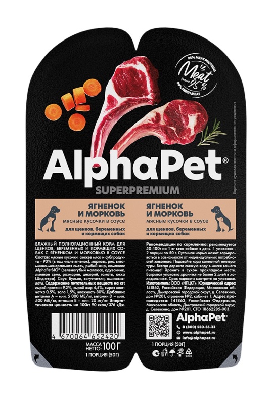 AlphaPet Superpremium влажный полнорационный корм для щенков, беременных и кормящих собак, с ягненком и морковью в соусе, 100г.