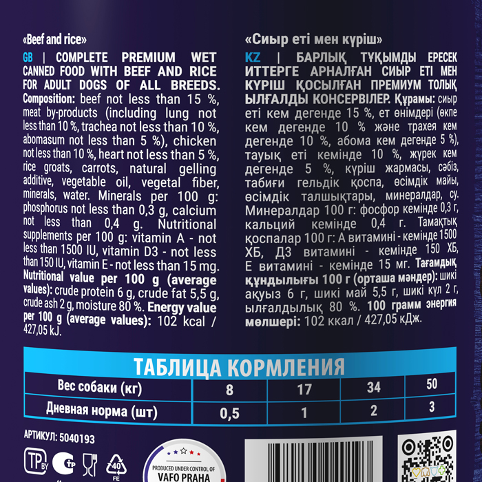Состав: говядина не менее 15 %, субпродукты мясные (в том числе легкое не менее 10 %, трахея не менее 10 %, сычуг не менее 5 %), курица не менее 10 %, сердце не менее 5 %, крупа рисовая, морковь, натуральная желирующая добавка, растительное масло, растительная клетчатка, минеральные вещества, вода. Минеральные вещества на 100 г: фосфор не менее 0,3 г, кальций не менее 0,4 г г. Пищевые добавки в 100 г: витамин А - не менее 1500 МЕ, витамин D3 - не менее 150 МЕ, витамин Е - не менее 15 мг. Пищевая ценность на 100 г продукта (средние значения): сырой протеин 6 г, сырой жир 5,5 г, сырая зола 2 г, влага 80 %. Энергетическая ценность 100 г продукта (средние значения): 102 ккал / 427,05 кДж.