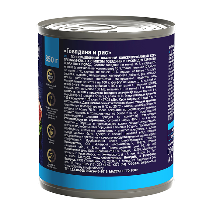 Полнорационный влажный консервированный корм премиум-класса с мясом говядины и рисом для собак всех пород, 850 гр.