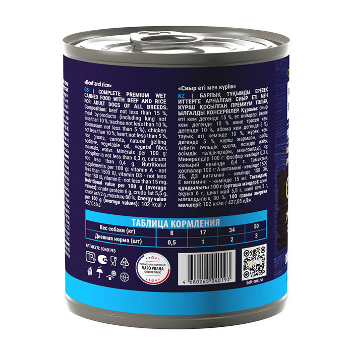 Натуральный сбалансированный корм для полноценного рациона вашего питомца. Свежая говядина и отборный рис гарантируют потрясающий вкус и соблазнительный аромат. Таурин в составе – важный ингредиент для поддержания остроты зрения и здоровья сердечно-сосудистой системы. Пребиотики обеспечивают здоровое пищеварение собаки. Консервированный корм содержит все необходимые витамины и минералы, которые требуются для ежедневного питания.