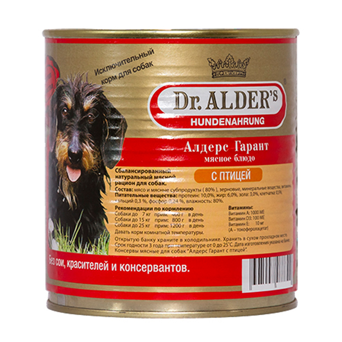 Алдерс Гарант, влажный полнорационный, сбалансированный натуральный мясной рацион для собак с птицей. Мясное блюдо, содержащее минимум 80% натурального мяса, без искусственных красителей, консервантов и вкусовых добавок. Рекомендовано к применению, как в чистом виде, так и в виде добавки к сухим кормам.