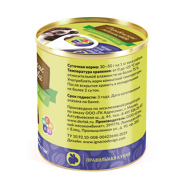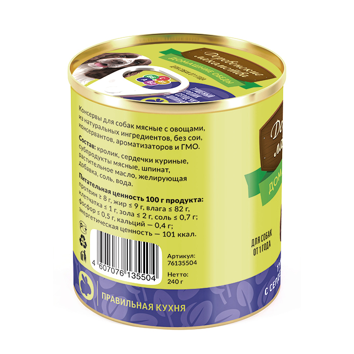Консервы для собак с кроликом, сердечками и шпинатом, 240г. Наверное, самое вкусное и полезное блюдо в нашем меню. Диетическое мясо кролика, обожаемые собаками куриные сердечки и богатый витаминами и минералами шпинат.