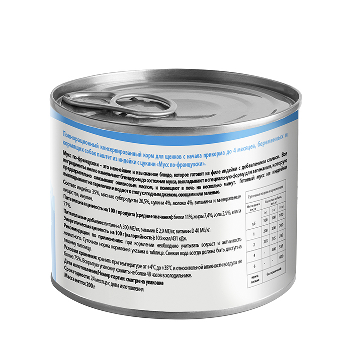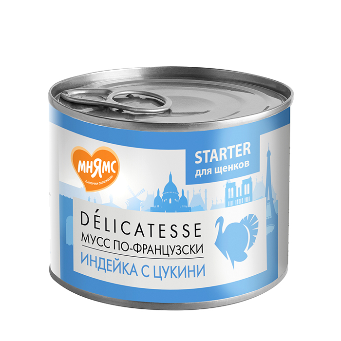 Влажный корм Мнямс Delicatesse для щенков до 4 месяцев, паштет из индейки с цукини "Мусс по-французски", 200г. Полнорационный суперпремиальный паштет "Мусс по-французски" с высоким содержанием мяса, созданный по мотивам культовых рецептов разных стран, адаптированных под потребности домашних питомцев. ✔ Подходит для щенков всех пород с момента прикорма и до 4 месяцев, беременных и кормящих собак ✔ Содержит большое количество животного белка: индейка 35%, мясные субпродукты - 26,5 % ✔ Содержит цукини, что благоприятно влияет на пищеварение и не раздражает слизистую желудка ✔ Содержит молоко и комплекс необходимых витаминов и минеральных веществ ✔ Обладает нежной текстурой и безупречным вкусом ✔ Без ГМО, сои, искусственных добавок и красителей.