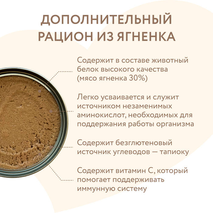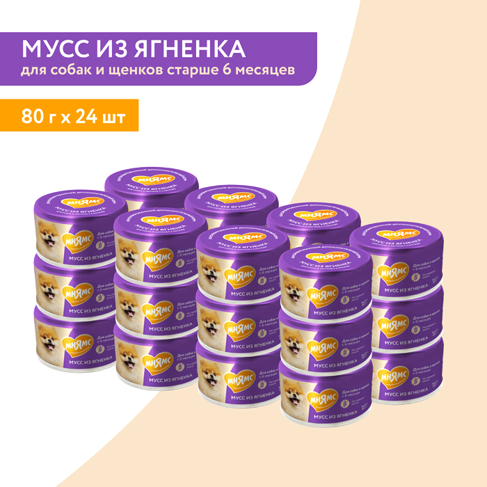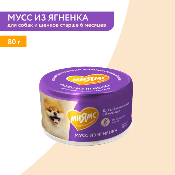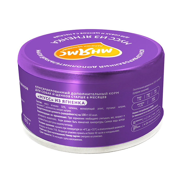 МНЯМС «мусс» из ягненка - консервированный дополнительный корм для собак и щенков старше 6 месяцев, 80г. Содержит в составе животный белок высокого качества (мясо ягненка 30%), который легко усваивается и служит источником незаменимых аминокислот, необходимых для поддержания здоровья и активности питомца, тапиоку – безглютеновый источник углеводов, а также витамин С, который помогает поддерживать иммунную систему. «Мусс» из ягненка рекомендуется использовать в качестве дополнительного источника питания к основному рациону вашей собаки. При этом важно учитывать индивидуальные потребности животного, включая его вес, возраст и уровень активности. Для собак разного веса предусмотрены различные нормы потребления, начиная от 80 г в день для собак весом до 5 кг и до 480 г для собак весом от 20 до 40 кг. Прекрасно подходит пожилым собакам, а также питомцам с чувствительным пищеварением и аллергией на курицу или злаки в составе кормов.