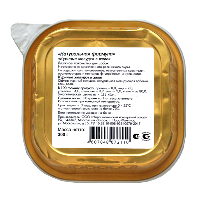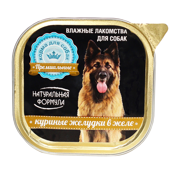 Влажный, мясной корм для собак "Куриные желудки в желе", ламистер 300г. Лакомство на основе куриных желудков - аппетитная, здоровая еда для средних и крупных пород. Если в повседневной занятости у вас редко есть время баловать любимца изысками собачьей кулинарии, наш натуральный субпродукт обеспечит ежедневную потребность животного в белке и микроэлементах. Ваша собака достойна отличного питания и заботы, даже если у вас высокая занятость - мы предлагаем влажный корм фаршевой консистенции, вкусное лакомство, быстро усвояемое пищеварительной системой собаки. Любимец оценит новый вкус корма, созданный именно для него. Мясо куриных желудков, мягкая консистенция, удобство и аппетитный вкус. Приятного аппетита вашему любимцу! "Натуральная формула" - марка российского производителя кормов с 12 летним опытом и широкой линейкой продуктов. Мы выпускаем качественные корма премиум, суперпремиум класса из натуральных мясных компонентов: без сои, ГМО, искусственных красителей, усилителей вкуса, без мясокостной и перьевой муки. Натуральная формула – натуральный продукт!