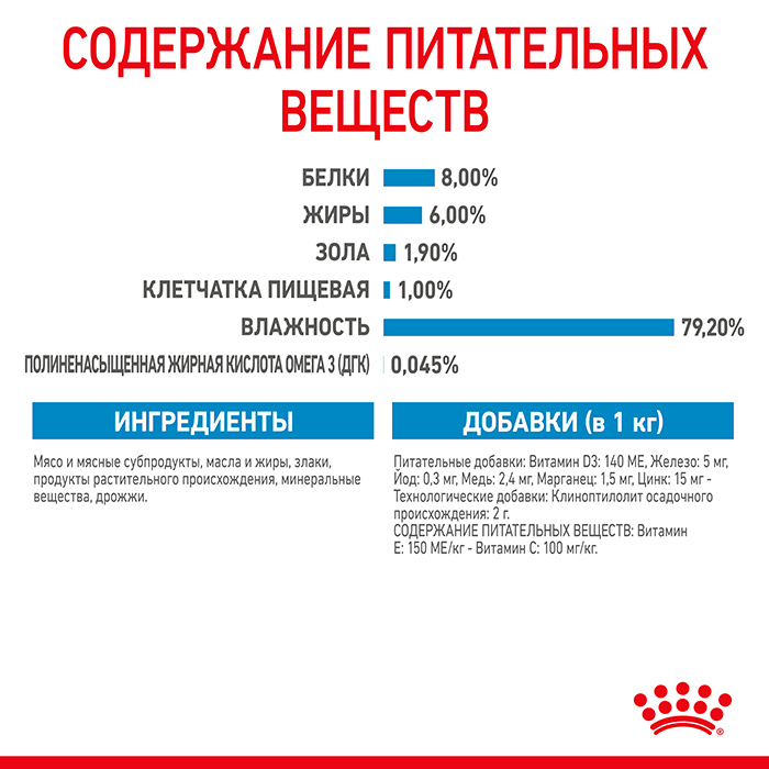 ИНГРЕДИЕНТЫ: мясо и мясные субпродукты, продукты растительного происхождения (в том числе растительная клетчатка), продукты животного происхождения, подсолнечное масло, витамины и минеральные вещества, рыбий жир, маннанолигосахариды, аминокислоты (в том числе таурин), загустители, краситель, сахара, бета-глюканы, экстракт бархатцев прямостоячих (источник лютеина). ДОБАВКИ (в 1 кг): Витамин Д3 – 120 МЕ, Железо – 8,8 мг, Йод – 0,4 мг, Медь – 1,5 мг, Марганец – 1,5 мг, Цинк – 24,3 мг, Технологические добавки - Клиноптилолит осадочного происхождения. СОДЕРЖАНИЕ ПИТАТЕЛЬНЫХ ВЕЩЕСТВ (100 г): Белки – 7,9 г, Жиры – 5,8 г, Зола – 2,1 г, Клетчатка пищевая – 1,4 г, Влага - 79 г, Витамин Е – 13 мг, Витамин С – 11 мг, Жирные кислоты Омега-3 – 0,2 г, Жирные кислоты Омега-6 – 1,8 г.