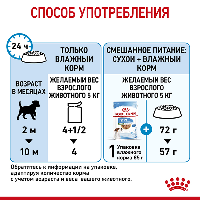 Royal Canin Mini Puppy Корм консервированный для щенков мелких пород в возрасте до 10 месяцев, кусочки в соусе, 85г. Корм влажный полнорационный для щенков мелких пород в возрасте до 10 месяцев Royal Canin Mini Puppy специально разработан с учетом потребностей в питательных веществах вашего щенка в период роста. Формула влажного продукта ROYAL CANIN® Mini Puppy (МИНИ ПАППИ) поддерживает иммунную систему, здоровое пищеварение, а также удовлетворяет энергетические потребности щенков. 1) Поддержание иммунитета: Фаза роста – важнейший этап в жизни собаки: это период больших перемен, открытий и новых встреч. В этот ключевой период иммунная система щенка развивается постепенно. Корм Mini Puppy (Мини Паппи) способствует усилению иммунного ответа щенка, в частности, за счет комплекса антиоксидантов, в том числе витамина Е. 2) Поддержание здорового пищеварения: Комплекс питательных веществ, включающий высококачественные белки (L.I.P.*) и пребиотики (ФОС и МОС), клетчатка и клиноптилолит благоприятно воздействуют на пищеварительную систему, поддерживая баланс кишечной флоры и оптимальную консистенцию стула. *L.I.P. – источники белков с высокой степенью усвояемости. 3) Повышенное содержание энергии: Формула с повышенной калорийностью помогает удовлетворить высокие энергетические потребности щенков мелких пород.