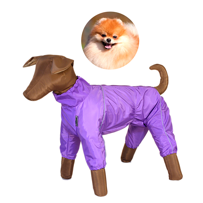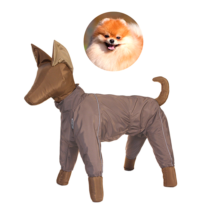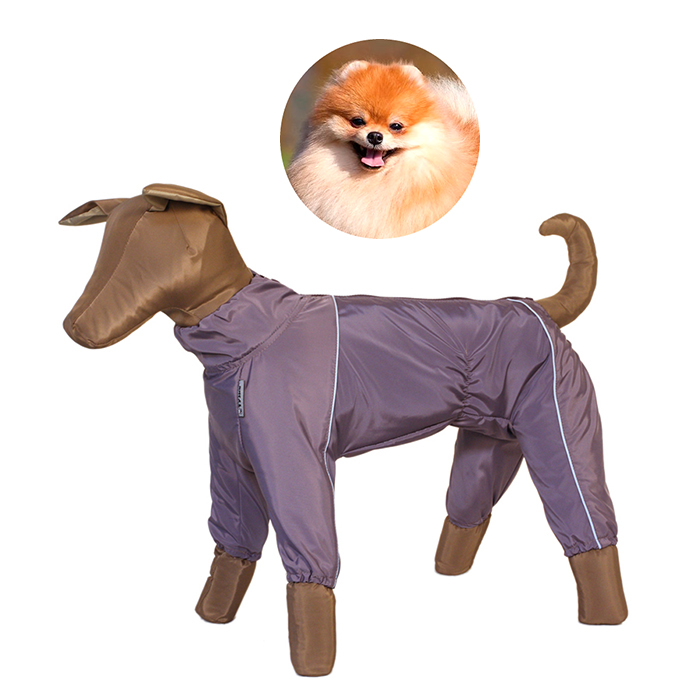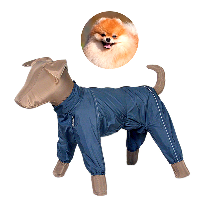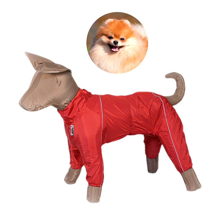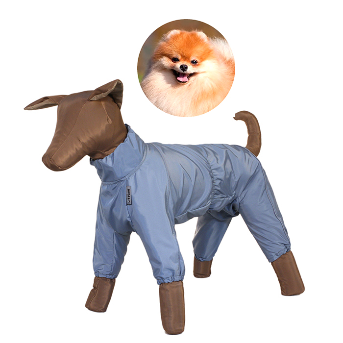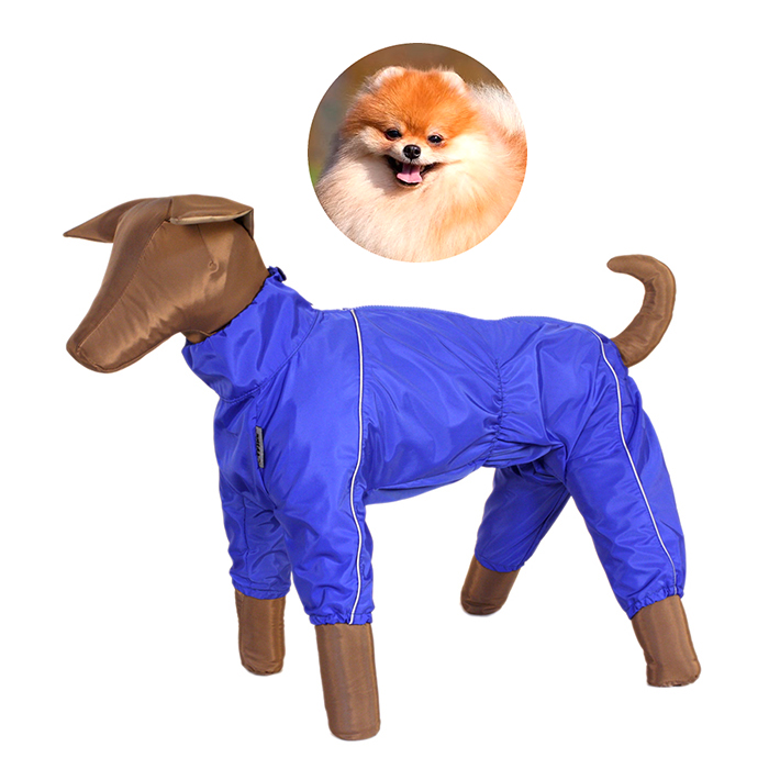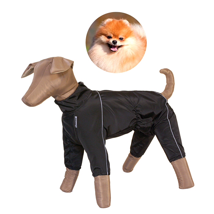 Застежка - разъемная молния типа «трактор» - застегивается на спине собаки, от хвоста к шее. Тканевая планка под молнией препятствует попаданию шерсти в зубцы молнии. Воротник-стойка, горловина может быть снабжена кулиской со шнурком с фиксатором для регулирования ворота по шее собаки. Штанины: нижняя часть собрана на резинку.