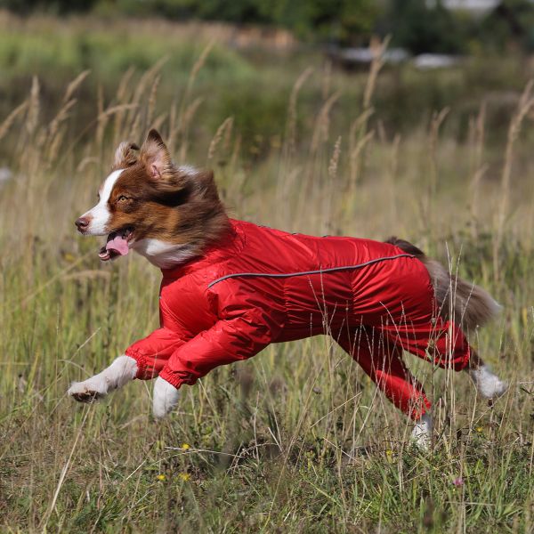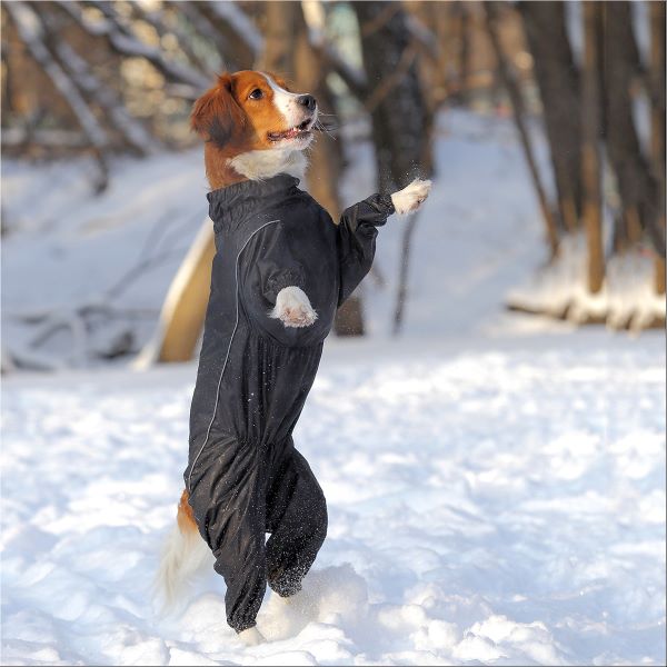 Комбинезон для собак эргономичен, удобен, не сковывает движений собаки при беге, во время игры и при дрессировке. Комфортная посадка по корпусу достигается за счет резинок-утяжек под грудью и животом. На воротнике имеется кнопка для фиксации. От попадания воды и грязи внутрь комбинезона низ штанин также сборен на резинку.