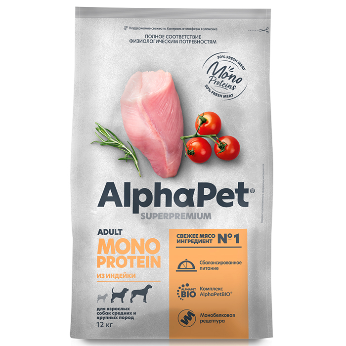 AlphaPet Superpremium MONOPROTEIN сухой полнорационный корм из индейки для взрослых собак средних и крупных пород, 12кг. Здоровый и активный питомец – главная задача каждого хозяина. Команда AlphaPet® создает и производит полезные корма высшей категории качества Holistiс, давая возможность каждому владельцу быть уверенным в правильном выборе кормления для своего животного. AlphaPet® MONOPROTEIN - благодаря единственному источнику животного белка, подойдет животным с пищевой непереносимостью. Индейка богата высокоусвояемым белком, фосфором и железом. Подходит для диетического питания, но в тоже время полноценно насыщает организм питомца. Благодаря высокому содержанию витаминов А В Е К Р и селена, индейка способствует укреплению костей, зубов, нервной системы и поддерживает нормальный гормональный фон. Приготовлено по инновационной технологии из свежего мяса и с содержанием большого процента мясного белка! Линейка кормов AlphaPet® MONOPROTEIN это: ✔ Свежее мясо ингредиент №1 в составе ✔ Большой процент мясного белка ✔ Формула "MONOPROTEIN" - снижает риск возникновения аллергии ✔ Уникальный комплекс AlphaPetBio ✔ Ингредиенты качества Human Graid ✔ Низкозерновая рецептура ✔ Поедаемость и вкусовая привлекательность проверены в собственном центре AlphaPet ✔ Без ГМО искусственных красителей, ароматизаторов и консервантов ✔ Не содержит пшеницу, кукурузу и глютен.