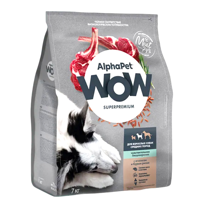AlphaPet WOW Superpremium сухой полнорационный корм с ягненком и бурым рисом для взрослых собак средних пород с чувствительным пищеварением, 7кг. Преимущества: 73% мясного белка. Свежее мясо в составе. Уникальный комплекс натуральных добавок AlphaPetBIO®. Оптимальное содержание полиненасыщенных жирных кислот (Омега-3 и Омега-6) для поддержания здоровья кожи и блеска шерсти. Натуральные ингредиенты. Не содержит ГМО, искусственные красителей и ароматизаторов. Ингредиенты, пригодные в пищу человеку, уровня Human Grade. Бережная технология, сохраняющая вкусовые и питательные свойства свежего мяса. Оптимальное соотношение биологически активных веществ, белков, жиров, витаминов и минералов для поддержания естественной защиты организма питомца.