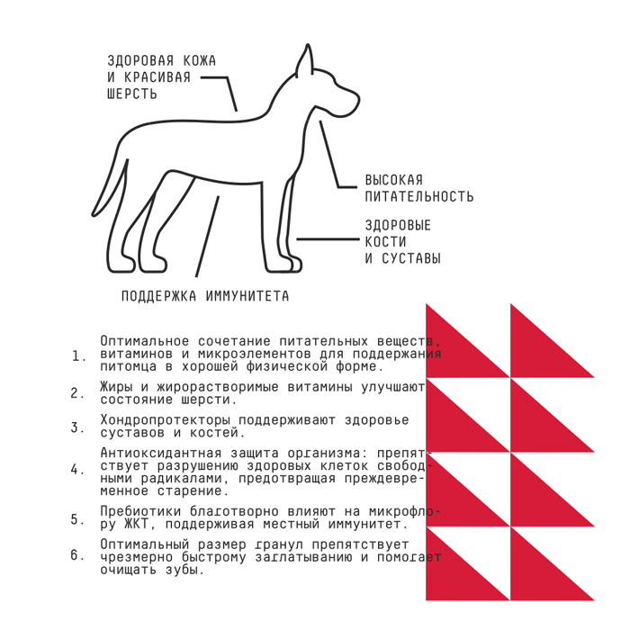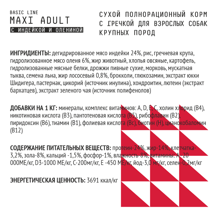 Ингредиенты: дегидрированное мясо индейки 24%, рис, гречневая крупа, гидролизованное мясо оленя 6%, жир животный, хлопья овсяные, картофель, гидролизованные мясные белки, дрожжи пивные сухие, морковь, мускатная тыква, семена льна, жир лососевый 0,8%, брокколи, глюкозамин, экстрактюкки Шидигера, пастернак, цикорий (источник инулина), хондроитин, лютеин (экстракт бархатцев), экстрактзеленого чая (источник полифенолов). Добавки: минералы, комплекс витаминов: А,D,Е,С, холин хлорид (В4), никотиновая кислота (В3), пантотеновая кислота (В5), рибофлавин (В2), пиридоксин (В6), тиамин (В1), фолиевая кислота (Вс), биотин (Н), цианокобаломин (В12). Питательные вещества: влажность-8%, протеин-24%, жир-14%, клетчатка- 3%, зола-8%, кальций-1.4%, фосфор-1%, витамины: А-20 000 МЕ/кг, D3-1000 МЕ/кг, С-200мг/кг, Е-450 МЕ/кг., цинк-130 мг/кг, йод-3,0 мг/кг, селен-0,2мг/кг. Омега-6 и -3 жирные кислоты-3.0%. Энергетическая ценность (ккал/кг): 3691.