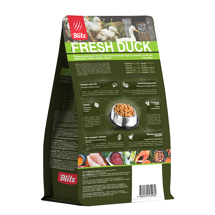 Blitz Fresh Duck, 1,5кг. Полнорационный сухой монопротеиновый корм со свежей уткой для взрослых собак мелких пород c 12 месяцев. Гипоаллергенный корм для чувствительного пищеварения. Монопротеиновый низкозерновой сухой корм для взрослых собак мелких пород максимально приближен к естественному питанию плотоядных. Благодаря входящим в состав ингредиентам, способствует укреплению здоровья собак. Утиный белок богат аминокислотами, отлично усваивается, идеален для питомцев с чувствительным пищеварением, не вызывает аллергии. Комплексное воздействие льняного семени и мякоти свеклы нормализует работу пищеварительной системы. Пребиотики FOS и MOS улучшают всасываемость полезных нутриентов, уменьшают возможность пищевой непереносимости. Рис, как источник углеводов, и свежая утка (14%) гарантируют легкую усвояемость и высокую аппетитность рациона.