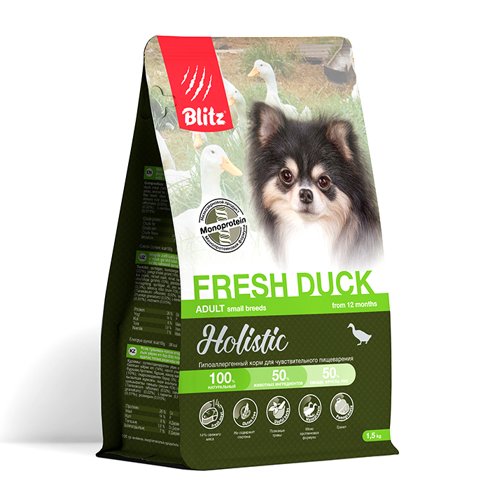 Блиц ХОЛИСТИК сухой корм для собак мелких пород, низкозерновой, с уткой и рисом, 1,5кг, BLITZ Holistic Small Breeds Fresh Duck