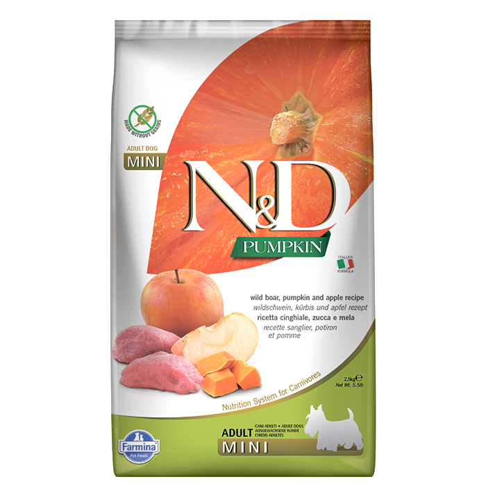 FARMINA N&D PUMPKIN ADULT MINI. Полнорационный беззерновой корм для собак мелких пород с кабаном, тыквой и яблоком, 2,5кг.