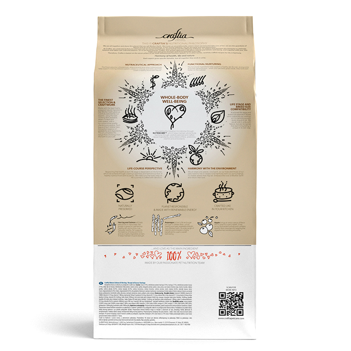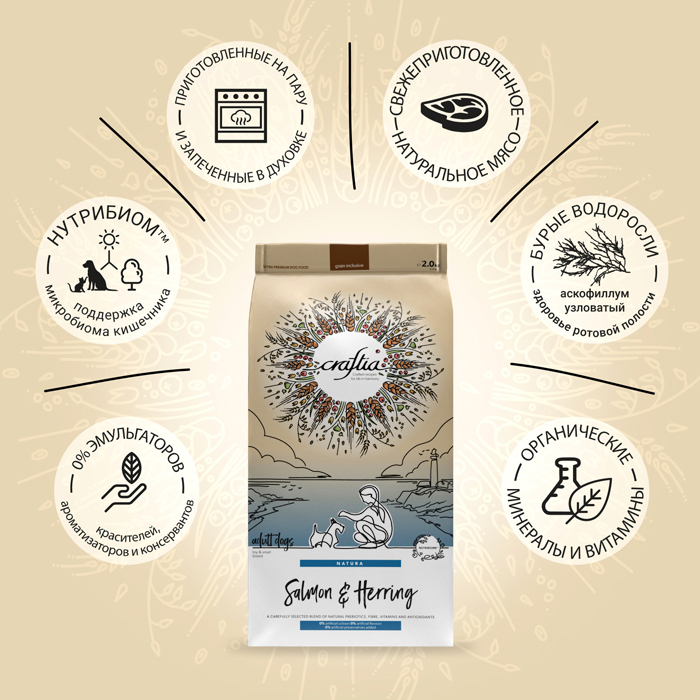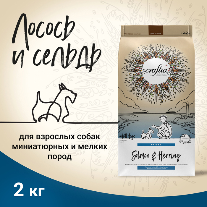 CRAFTIA NATURA сухой корм для взрослых собак миниатюрных и мелких пород из лосося и сельди, 2кг. CRAFTIA NATURA — корм для собак ультрапремиум класса, созданный с любовью к природе. Основные источники белка в корме — лосось и сельдь. Они богаты незаменимыми Омега-3 жирными кислотами и минеральными веществами. Жирные кислоты контролируют воспалительные процессы в организме, что хорошо влияет на здоровье суставов. Легкоусвояемый рыбный белок способствует формированию крепкой мускулатуры, улучшает состояние кожи. ● Источники углеводов — спельта, бурый рис, ячмень, овес и просо. Специально подобраны злаки с разным гликемическим индексом, чтобы питомец дольше чувствовал себя сытым: глюкоза поступает в организм постепенно, а значит, чувство голода не наступает дольше. ● Источники клетчатки — свекольная пульпа, волокна гороха и люцерновая мука. Свекольная пульпа способствует здоровью слизистой кишечника, гороховая клетчатка стимулирует перистальтику, а люцерновая мука способствует размножению полезной микрофлоры кишечника. ● Суперфуды в корме — спаржа, черника, клюква, ацерола и многие другие. Суперфуды являются источниками витаминов, биологически активных компонентов и обладают антиоксидантными свойствами. ● Размер гранул корма адаптирован для собак мелких и миниатюрных пород. Попробуйте Craftia, ощутите уверенность в качестве корма своего питомца — и наслаждайтесь жизнью в гармонии с природой!